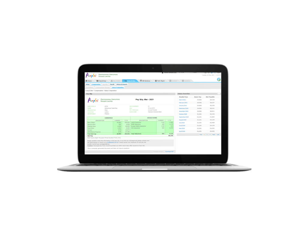 Comprehensive Payroll Setup that caters to all sorts of globally utilized allowances, deductions and other salary components. Customizable payroll disbursement cycle along with E-Banking Portals integration.