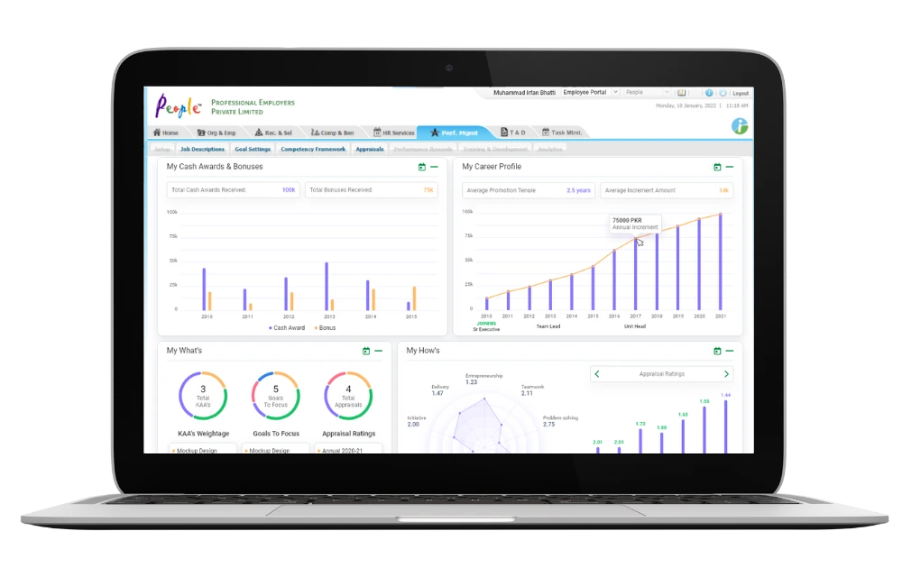 All kinds of performance appraisals with customizable formats including Probation Evaluations, Annual Appraisals and Mid-Year Appraisals. Key Accountability Areas for each employee with weightages.